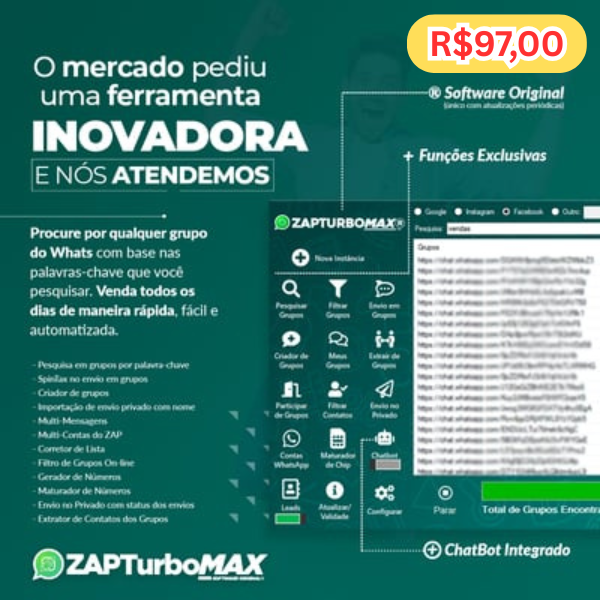 ZAPTurboMAX®R$ 97,00 Única ferramenta com IA para máxima proteção contra bloqueios Saiba mais Categorias: Crescimento Profissional, Ferramentas Descrição Descrição Única ferramenta com IA para máxima proteção contra bloqueios Produtos relacionados Cursos/Crescimento Profissional/Marketing Digital CursosQUER SABER COMO ANÚNCIAR NO GOOGLE ADS PASSO A PASSO por ROTA DIGITAL R$ 59,90 Comprar produto OfertaCursos/Crescimento Profissionalcurso conserto de celulares 2.0 Educacional, Cursos Técnicos e Profissionalizantes R$ 195,00 O preço original era: R$ 195,00.R$ 99,99O preço atual é: R$ 99,99. Comprar produto Cursos/Crescimento ProfissionalGuia Instalação Elétrica Residencial R$ 59,99 Comprar produto